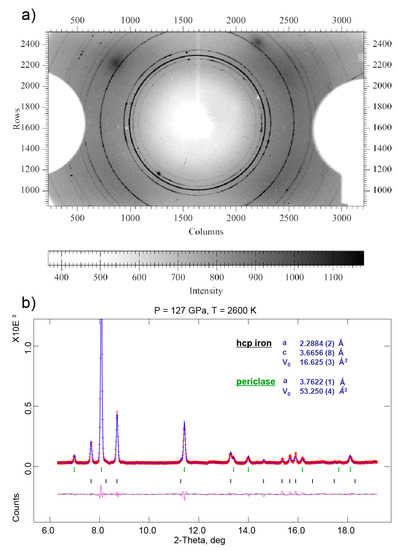 - Dubrovinsky, L.S.; Saxena, S.K.; Tutti, F.; Rekhi, S.; LeBehan, T. In Situ X-Ray Study of Thermal Expansion and Phase Transition of Iron at Multimegabar Pressure. Phys. Rev. Lett. 2000, 84, 1720–1723. [Google Scholar] [CrossRef]