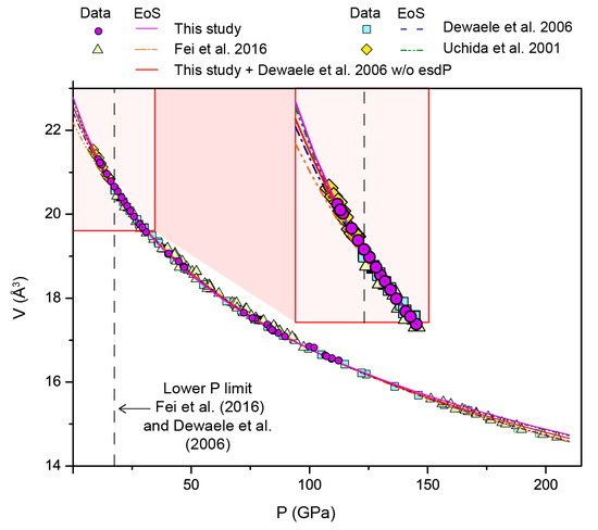 - Tange, Y.; Nishihara, Y.; Tsuchiya, T. Unified analyses for P-V-T equation of state of MgO: A solution for pressure-scale problems in high P-T experiments. J. Geophys. Res. 2009, 114, B03208. [Google Scholar] [CrossRef]
