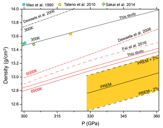 - Sakai, T.; Takahashi, S.; Nishitani, N.; Mashino, I.; Ohtani, E.; Hirao, N. Equation of state of pure iron and Fe0.9Ni0.1 alloy up to 3Mbar. Phys. Earth Planet. Inter. 2014, 228, 114–126. [Google Scholar] [CrossRef]
