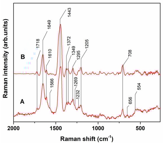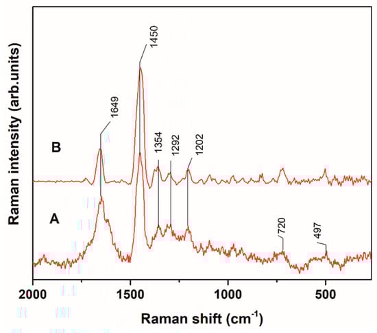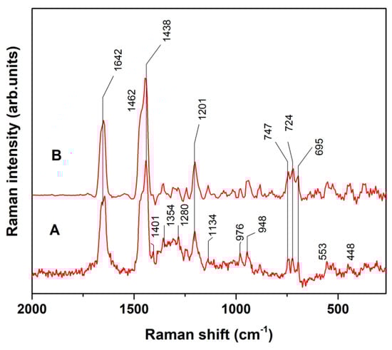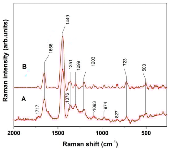 Comparison of Raman spectra of resin from Khatanga (Russia) collected with laboratory (A) and handheld (B) equipment.