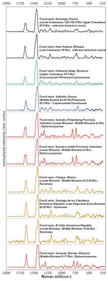 The samples subjected to analysis came from a great collection of fossil resins of Günter Krumbiegel, who was a German geologist and palaeontologist []. The specimen’s characteristics containing the information on localities, botanical sources and geological environments of deposition as well as detailed data on alterations during diagenesis and/or catagenesis are summarized in Table 1. To provide a correlation between the resins NIR-Raman spectra and their geological backgrounds, only specimens that were not subjected to the redeposition or which provenience was known were used for the study. The oldest resins of the Cretaceous age were considered as non-redeposited.