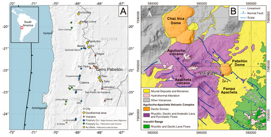 (A) Location of the Cerro Pabellón geothermal system in the Altiplano of northern Chile. (B) A geological map of Cerro Pabellón showing the location of the PEXAP-1 drill hole (red circle). Figures modified from [36,37].