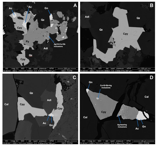 (A–D) show back-scattered electron (BSE) images of chalcopyrite from the Cerro Pabellón geothermal system. Chalcopyrite is euhedral to subhedral and is mostly free of mineral inclusions, although some grains show Ag-bearing micro-inclusions (e.g., (D)) and larger inclusions of Cu–S–Sb–Ag-bearing minerals (e.g., (A) and (D)). Abbreviations: chalcopyrite (Cpy), pyrite (Py), acanthite (Ac), galena (Gn), adularia (Adl), calcite (Cal), quartz (Qz).