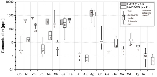EMPA and LA-ICP-MS data are reported in Tables S1 and S2, respectively. The summary statistics of trace element concentrations are presented as a boxplot in Figure 3. Only inclusion-free LA-ICP-MS analyses were included in the boxplot (see data in Table S2).