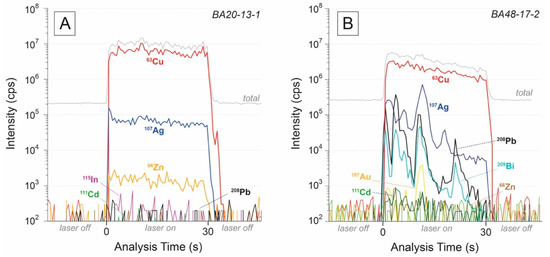Time (s) vs. intensity (cps) laser ablation inductively coupled plasma mass spectrometry (LA-ICP-MS) depth-concentration profiles of selected isotopes in chalcopyrite from Cerro Pabellón. The 107Ag spectrum in (A) shows a flat profile, suggesting Ag incorporation into solid solution in chalcopyrite (or as nanoparticles not resolved in the LA-ICP-MS profiles). In contrast, the spiky 107Ag signals in (B) are indicative of Ag being present as micro-inclusions in chalcopyrite.