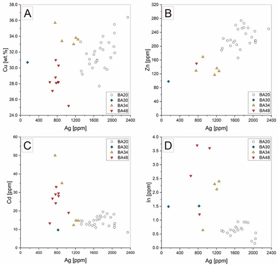 Further information on trace element speciation in chalcopyrite can be obtained by inspecting the LA-ICP-MS dataset as a function of depth, where differences in trace element concentrations are noteworthy. Figure 5 shows bivariate plots for selected elements in chalcopyrite from Cerro Pabellón for each analyzed sample. Copper and Ag configure a positive trend only in the shallowest sample (BA-20), while the data points in samples BA-30, BA-40, and BA-48 show a scattered pattern (Figure 5A). The correspondence between Cu and Ag in sample BA-20 suggests that both elements are structurally related [45], in agreement with the fact that almost all analyses of this sample are inclusion-free. In contrast, it is likely that Ag in chalcopyrite from the three other samples (i.e., BA-30, BA-40, and BA-48) is contained both in solid solution and also forming Ag-bearing micro- to nano-sized inclusions, as suggested by the relative abundance of analyses with spiky LA-ICP-MS profiles in the deeper samples (e.g., BA-48, Figure 4B). Finally, Zn shows a positive trend with Ag for all samples, suggesting that these two elements are also correlated (Figure 5B). Cd and In do not show any clear correspondence with Ag, although the data indicate that higher concentrations of Cd and In are generally correlated with lower Ag concentrations.