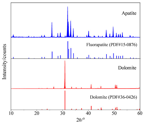 Natural apatite and dolomite samples were obtained from Wengfu Plant in Guizhou Province, China. The single minerals were selected by hand first, and the X-ray diffraction (XRD) (X’Pert PRO, PANalytical Company, Almelo, the Netherlands) test was used to identify the mineral composition and purity of the polished samples (Figure 1). The XRD results showed that the peak of the apatite sample was the same as that of the fluorapatite, which indicated that the main component of the apatite sample was fluorapatite. The XRD of the dolomite sample was consistent with the standard dolomite peak. The apatite and dolomite samples were of high purity and could be used as a single mineral for experimental research. These mineral lumps were cut into small pieces of about 10 mm × 10 mm × 5 mm for contact angle and roughness measurements.