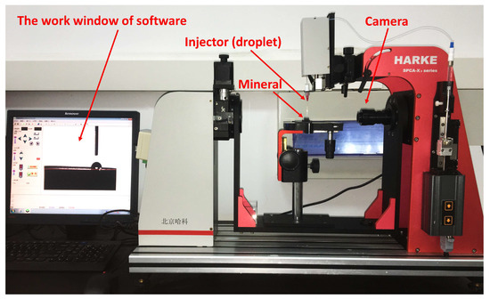 The contact angle measurements were carried out to characterize the wettability of mineral surfaces. The droplet method was used to measure the contact angle of the mineral surface (HARKE-SPCAX3, Beijing Hake Test Instrument Factory, Beijing, China) as seen in Figure 3. The specific steps were as follows [37]: The mineral was immersed in a certain concentration of the collector solution for 12 h and then naturally dried and placed on the test platform. A water droplet with a volume of about 2 μL was squeezed out by a syringe and then dropped on to the mineral surface slowly and automatically. After the droplet spread stably on the mineral surface (about 5 s), the “baseline circle” in the instrument’s software was used. Each contact angle was measured three times at different surface areas, and the final value was determined using the arithmetic mean value.