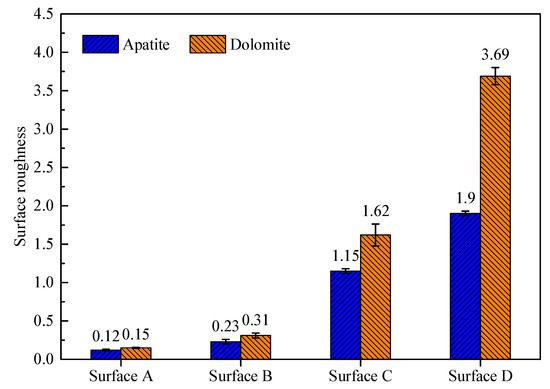 The results of roughness measurements at different surfaces of apatite and dolomite are shown in Figure 4.
