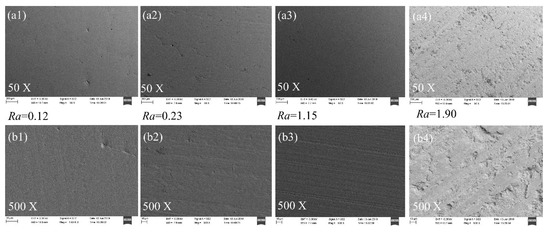 Figure 5. Surface morphology of apatite with different roughness by SEM. (a1) and (b1) are 50 and 500 times enlarged views of surface A, respectively; (a2) and (b2) are 50 and 500 times enlarged views of surface B, respectively; (a3) and (b3) are 50 and 500 times enlarged views of surface C, respectively; (a4) and (b4) are 50 and 500 times enlarged views of surface D, respectively.