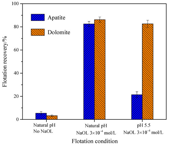 The results indicated that the CMC of NaOL was approximately 1 × 10−3 mol/L, which is consistent with the results in the literature [37]. On the other hand, for the beneficiation of calcium magnesium phosphate ore, the reverse flotation was a widely used high-efficiency separation process using the sulfuric acid, phosphoric acid, etc. as the adjusting agent to remove dolomite. The typical apatite and dolomite single minerals flotation recovery are displayed in Figure 8. The natural floatability of apatite and dolomite particles was quite poor. When a certain concentration of NaOL was added, the floatation recoveries of them were both over 80%, but there was a lack of separation selectivity. When the phosphoric acid was used to adjust the pH before the collector, the recovery of dolomite particles decreased slightly, but it still had good floatability, while apatite particles were strongly inhibited, and the floatability decreased to about 20%, indicating that they had a good separation selectivity under acidic conditions [1,2].