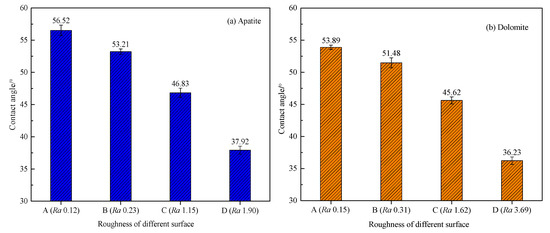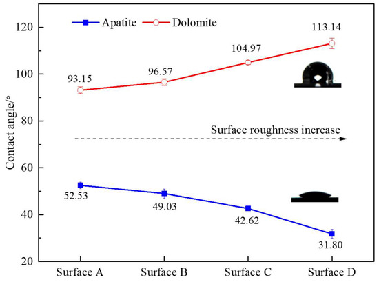 Contact angles of the surfaces of natural apatite and dolomite were around 36° to 56°, and the difference between them was small (Figure 9). Previous studies have reported that the surface of apatite was hydrophilic with a contact angle of about 10° [13]. However, these angles in Figure 9 were larger than the theoretical values of a hydrophilic apatite or dolomite surface. This finding may be related to the organic matter of black collophane that originates from black shales in sedimentary rocks [37] as the apatite and dolomite single mineral were selected from the sedimentary phosphorite. It was consistent with the result reported in the literature that the contact angle of a natural smooth polished apatite block was about 58° by the captive bubble method [37]. Thus, they were still considered as relatively hydrophilic surfaces. The contact angle of apatite decreased from 56.5° to 37.9° from surface A to surface D, and that of dolomite decreased from 53.89° to 36.23°. Both hydrophilic apatite and dolomite showed the rule that the rougher the surface, the stronger the natural hydrophilicity.