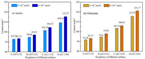 Figure 10. Effect of surface roughness on contact angle of (a) apatite and (b) dolomite surfaces at natural pH in the presence of NaOL (3 × 10−5 mol/L and 3 × 10−4 mol/L).