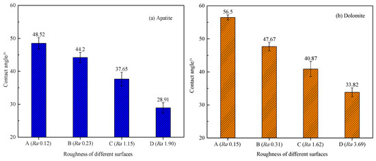 The contact angles of apatite and dolomite surfaces with different surface roughness without NaOL treatment are shown in Figure 9.