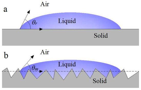 In Equation (7), r is the roughness factor (equal to the ratio of the actual contact area of the solid-liquid interface to its projected area, r   ≥ 1). From Equation (7), it can be seen that for the original hydrophilic surface, the larger the r value is, the smaller the θ m is; for the original hydrophobic surface, the larger the r value is, the larger the θ m is. When the roughness increases, the wettability of the hydrophilic surface becomes better, while the wettability of the hydrophobic surface further decreases.