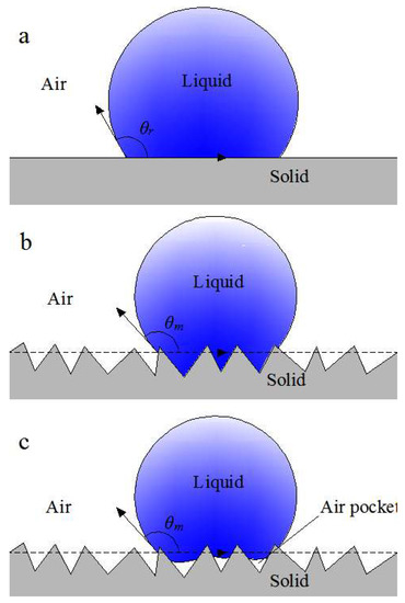 Figure 14. Wet state model of a hydrophobic surface: (a) Young model; (b) Wenzel model; (c) Cassie.