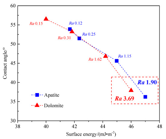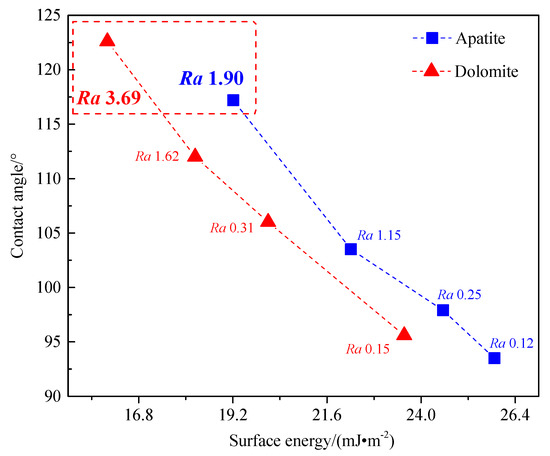 It can be seen from Figure 15 that for the natural hydrophilic apatite and dolomite surfaces, with the increase of surface roughness, the surface energy of apatite and dolomite increased gradually, and the contact angle decreased gradually, that is, the wettability increased gradually. This could be interpreted as, for the mineral surface with a larger surface energy, water tended to spread on the surface to reduce the surface energy, and the surface was wetting. For the natural mineral surface, the larger the surface roughness was, the larger the surface energy was, i.e., the stronger the surface hydrophilicity was.
