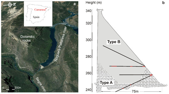(a) View of the Camarasa Dam; (b), sketch with the distribution of the two concrete types (modified from [26] and the location of the cores (black lines) and samples (red)).