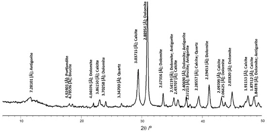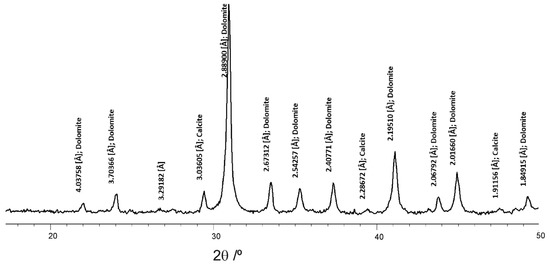 XRPD (X-ray powder diffraction) pattern of the dolostones used as aggregates to make the Camarasa concrete.