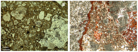 Microscope image of the Camarasa type A concrete. (a) General view; (b) sample stained with red alizarin that shows a red rim of calcite in the contact dolomite aggregate-paste. dol, dolomite; cal, calcite.