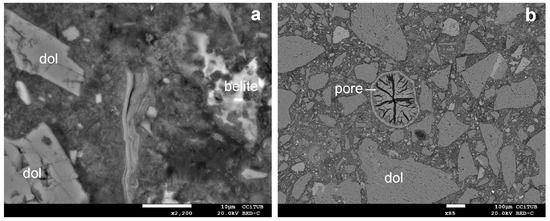 In addition, the SEM observations also showed the occurrence of ettringite and belite. Some illite elongated crystals were detected by SEM-EDS, and nests of belite, “bunch of grapes”, with dark hydration rims dispersed in the interstitial component or paste could occasionally be observed (Figure 9a), indicating that the hydration of cement was not complete. Unconnected porosity was randomly distributed in the paste. Most cavities exhibited recrystallization rims or were totally or partially filled of calcite, ettringite, or portlandite (Figure 9b).