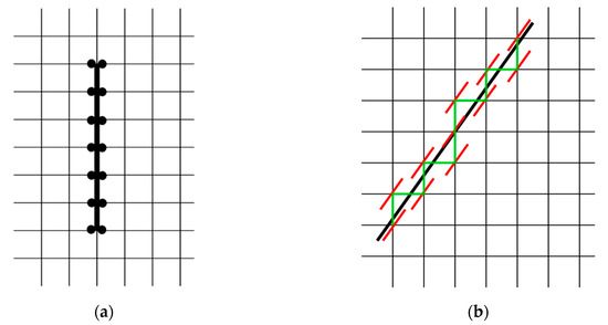 The discretization scheme of such an algorithm is shown in Figure 1a. The fracture is indicated by a bold line, around it there is a fragmentation of the nodes of the computational grid used for the correct calculation of the boundary condition on Fracture (5). The novel approach assumes that the fracture does not coincide with the boundaries of the cells. Figure 1b schematically depicts an approach for identifying fractures in a grid. A fracture (thick black line) does not fall into the nodes of the grid. However, a discrete analogue of the fracture is considered (green line), which passes along the boundaries of the cells. Fracture is replaced by a bunch of tiny fractures scattering around it (red lines).