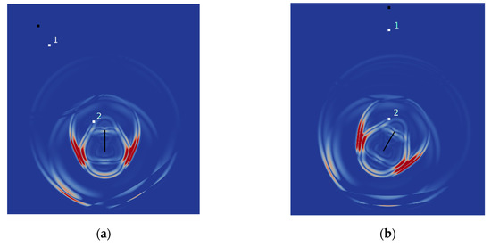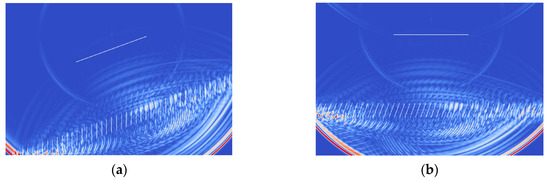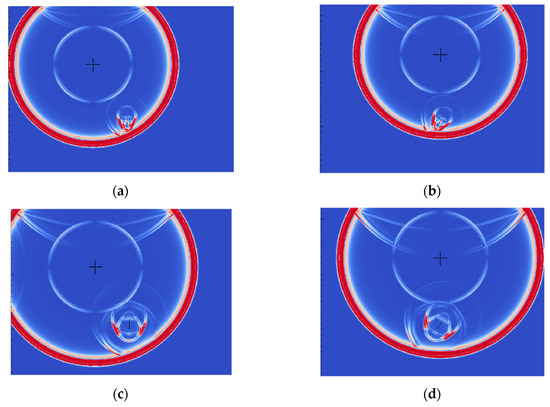 In all Figure 3a–d, the fracture is depicted in the center of the computational domain by a black line. The source is indicated by a black cross and is located directly above the source-receiver system (the black line is directly below the propagating wave). Figure 3a shows a wave for the initial setting of the source-receiver system relative to the fracture. In Figure 3b, the source-receiver system is located at an angle of 30° relative to its initial position (Figure 3a). In all wave patterns, wave reflections from the fracture are clearly visible.
