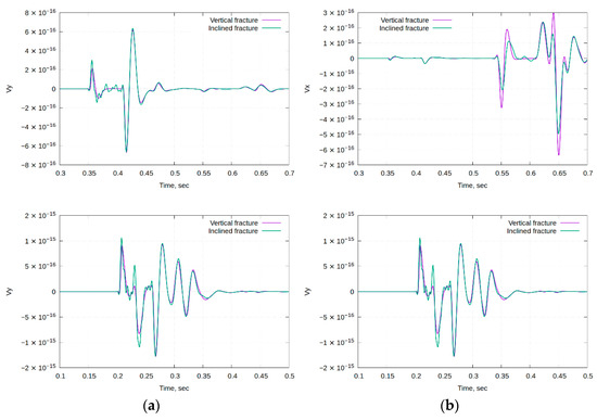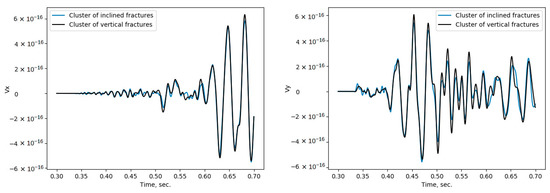 Figure 5 shows one-dimensional graphs of the values of the velocity components at one of the receivers versus time for two calculations. Only the anomalous field from the fracture is shown. The fracture is rotated at an angle of 30°. Figure 5a shows the field from the fracture on receiver 2, and Figure 5b shows the field from the fracture on receiver 2. A fairly good qualitative and quantitative agreement of the responses is seen. For the case of an inclined fracture in the time domain, t = 0.35–0.4 s “rattling” is observed due to the fact that the fracture structure is tied to discrete mesh cells. However, the main peak in the time domain is t = 0.4–0.45 s coincides and does not give a “rattle”. Further passage of the wavefront also coincides well for both settings.