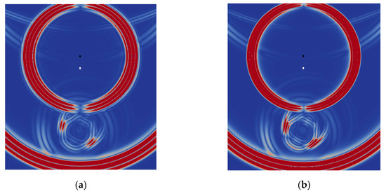 In this test, a model similar to the previous one was used with the 30° inclined fracture. The source was located at a distance of 600 m from the center of the fracture, the receiver was located at a distance of 500 m from the center of the fracture. The first calculation was carried out on structural grids using the grid-characteristic method and the fracture model proposed in this paper. The second calculation was carried out on unstructured mesh using the DG method. The wave snapshots are shown in Figure 6. The source position is shown by a black dot in the figure, the receiver by white a one. A 30 Hz Ricker pulse was used as a signal source. Unlike previous calculations, a directional source was used as the source (it was selected in connection with the features of the code for DG). It can be seen from the figure that the wave snapshots coincide qualitatively well. The response from the fracture has the same structure.