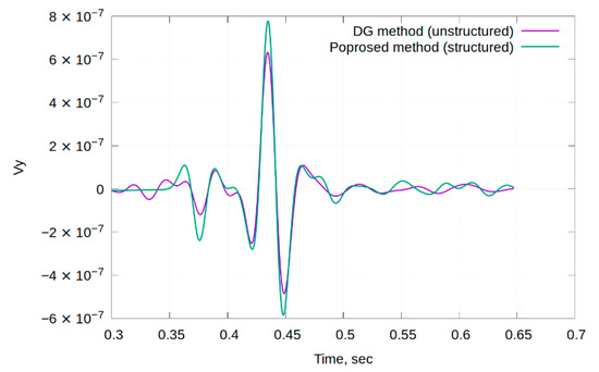The distribution of the vertical velocity component at the receiver versus time is shown in Figure 7. Only a part of the signal is shown at time instants from 0.3 to 0.7 s, where there is a response from the fracture. The figure shows that the main response from the fracture coincides quite well. The arrival times are the same, the amplitude value is slightly different. The response from the fracture, calculated by the grid-characteristic method on structural grids is more “rattling”, this is due to the discrete geometry of the fracture model.