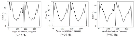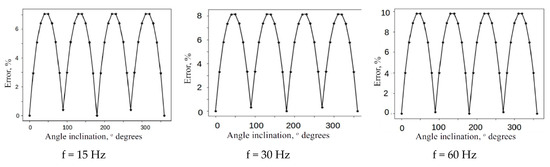 where is the value of velocity at the receiver; the error was summed over all receivers. From Figure 6, it follows that with decreasing frequency, the error decreases when the source-receiver system or fractures are rotated by the corresponding angle. At a frequency of 15 Hz, the maximum error (about 6.5%) is 1–2% less than the maximum error of the similar calculations at a frequency of 30 Hz (about 8%), which, in turn, is less than the maximum calculation error at a frequency of 60 Hz (about 10%). This result correlates well with the fact that with decreasing sampling size the error falls. Due to the fact that the new model of fractures is tied to the size of the cell, the longer waves produce a better result. Moreover, for fractures with a lower slope, the solutions have a smaller error.