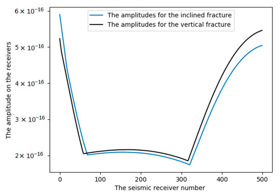 Modern methods of interpretation increasingly take into account the absolute value of the amplitude of seismic signal, and not just the arrival times. As shown in Figure 5, the main peaks of the wave response from fractures come at the same time. Figure 10 shows the plots of the maximum amplitude of the seismic signal vs. the receiver number, based on the computations of the wave field reflections from the single fracture. We have compared the amplitudes of the seismic reflections from the inclined fracture under the angle of 30° with the amplitudes of the seismic reflections from the fracture, parallel to the boundaries of the grid. In our modeling study, 500 receivers of seismic signals were used. The blue line in Figure 10 denotes the peak amplitudes of the seismic reflections from the inclined fracture. The black line depicts the peak amplitudes of the seismic reflections from the vertical fracture, parallel to the boundaries of the grid cells. The plots show a similarity in the responses from the inclined and vertical structures.