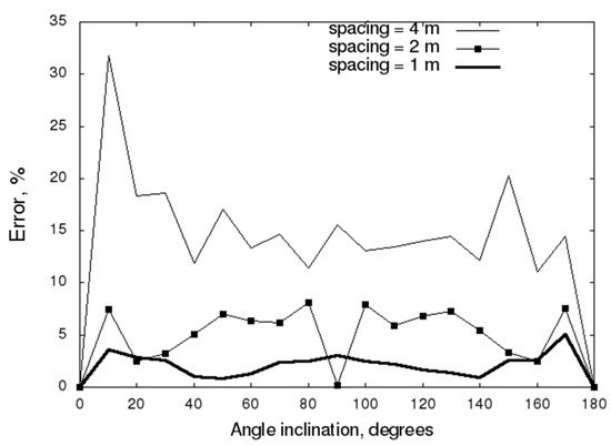 Figure 9 shows a similar result for an anomalous field only (the field due to the fracture). The deviation values here are more significant, and they are associated with the discreteness of the inclined fracture. With increasing frequency, i.e., decreasing wavelength, the error increases. In Figure 5, peaks are visible that can give such a deviation in error; however, the qualitative coincidence of the waveform and the main peaks is quite good.