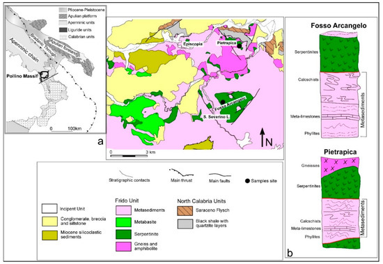 (a) Synthetic geological map of the Liguride Complex in the Pollino Massif and location of the study area, (b) tectonic and stratigraphic sequence with the ultramaphic and continental rocks contact (not to scale).