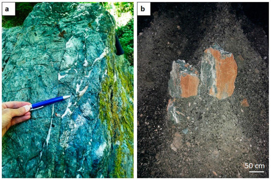Serpentinites in this site crosscut by metadolerite dykes that were affected by metamorphism under relatively HP/LT (blueschist facies) conditions during the formation of the Apennine accretionary prism [45,53,54,55]. The Pietrapica site is characterized by a complex exposure of dark-green cataclastic serpentinites (SpPP) with several slip surfaces and badland-like morphology. The serpentinite shows quartz-carbonate veins with talc-rich domains (Figure 2b). At the surrounding of the Pietrapica area, no rocks with any experience of HP/LT metamorphism occur.