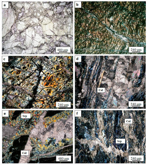 Photomicrographs of SpFA samples: (a) The serpentinite breccia characterized by serpentinite fragments in a carbonate matrix, plane polarized light, 4×; (b) schistosity with crenulation cleavage, crossed polarized light, 4×; (c) relict olivine grains in the core of the mesh-texture. Olivine is replaced by calcite, the mesh-texture are cross-cut by carbonate veins, crossed polarized light, 4×; (d) sub-parallel carbonate veins, crossed polarized light, 4×; (e) vein infill with carbonate and serpentine minerals, crossed polarized light, 4×; (f) carbonate veins with anastomosing network, crossed polarized light, 4×. Cal = calcite; Srp = serpentine. Abbreviation after [72].