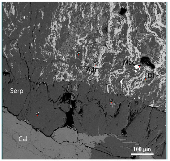 Secondary-electron image of serpentinite SpFA showing the presence of andradite (Adr), diopside (Di), and small crystals of magnetite (Mag) analyzed by EMPA. Adr = andradite; Cal = calcite; Di = diopside; Mag = magnesite; Serp = serpentine.