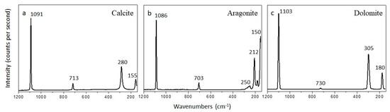 μ-Raman spectroscopy has been used as a complementary technique to the X-ray diffraction analysis to better identify the carbonate minerals (calcite, aragonite, and dolomite) of both serpentinites and crosscutting veins. The optical vibrations are internal vibrations of the CO3 group (three Raman bands lying between 1500 and 700 cm−1) and external or lattice vibrations involving translation and librations of the CO3 groups relative to the Ca or Mg atoms (500–100 cm−1) [80]. In our samples, calcite is characterized by a dominant Raman band at 1091 cm−1, minor bands at 713, 280, and 155 cm−1 and a very weak band at 1439 cm−1 (Figure 6a). The Raman spectrum for aragonite signals are detected for a dominant Raman band at 1086 cm−1, two strong bands at 212 and 150 cm−1, and three weak bands at 703, 250, and 180 cm−1 (Figure 6b). In dolomite, the main peak in the Raman spectrum occurs at 1103 cm−1, whereas the weak peaks are at 730, 305, and 180 cm−1 (Figure 6c).