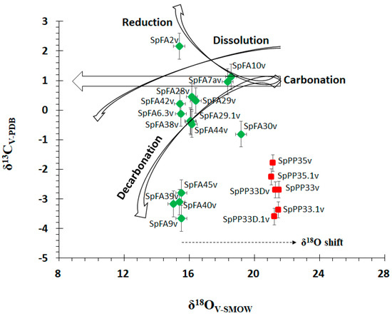 The C and O isotope ratios of carbonates from the veins of the SpFA have two distinct ranges. The δ13C values range from −0.81‰ to +2.16‰ and from −2.78‰ to −3.66‰ vs. V-PDB, corresponding δ18O values are between +15.02‰ and +16.38‰ vs. V-SMOW, except for three samples (SpFA7av, SpFA30v, SpFA10v) having δ18O values slightly more positive (between +18.36‰ and +21.53‰ vs. V-SMOW). The δ13C values of carbonate veins of the SpPP are in the range from −1.78‰ to −3.60‰ vs. V-PDB, and the corresponding δ18O average value is +21.3‰ (1σ = 0.18; n = 6) vs. V-SMOW.