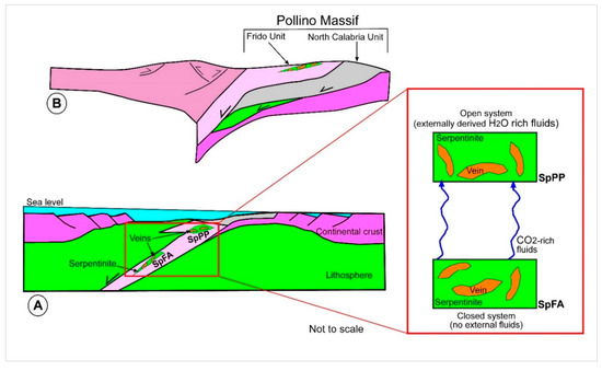 Mantle peridotites are exposed on the seafloor at slow and ultraslow spreading mid-ocean ridges [1]. Seafloor spreading developed in areas characterized by tectonic extension and detachment faults, allowing uplift and exposure of mantle peridotite in oceanic core complexes [2,3,4,5,6,7]. Due to the interaction with seawater and deep hydrothermal fluids, seafloor peridotites are readily serpentinized over a wide range of conditions [8]. Serpentinites occurring in ophiolitic complexes are important for volatile cycling and fluid mobile elements acting as a source for water, carbon, sulfur, chlorine, boron, arsenic, and nitrogen [9,10,11,12,13,14,15,16,17,18,19,20,21,22,23,24,25,26]. These rocks, in fact, in the last years have been widely studied to gain a better understanding of their reactivity with respect to hydrothermal fluids promoting carbonation processes and mineral immobilization of large amounts of CO2 [27,28].
