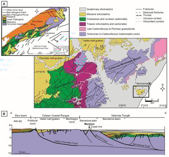 Geological setting. (A) Location and schematic map of the Catalan Coastal Ranges and magnification of the Littoral Chain around the study area. The Montjuïc Hill is marked with a black square. (B) Cross-section of the CCR indicated in (A) [].