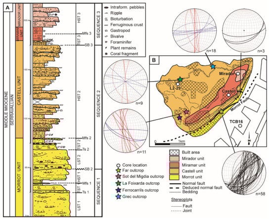 (A) General stratigraphic section of Montjuïc Hill []. (B) Arrangement of the lithostratigraphic units in the Montjuïc Hill [] and Schmidt lower-hemisphere stereoplot projections of the different generations of fractures found in the study area. The three generations of fractures are indicated with different colors: set 1 (black), set 2 (blue), and set 3 (red).
