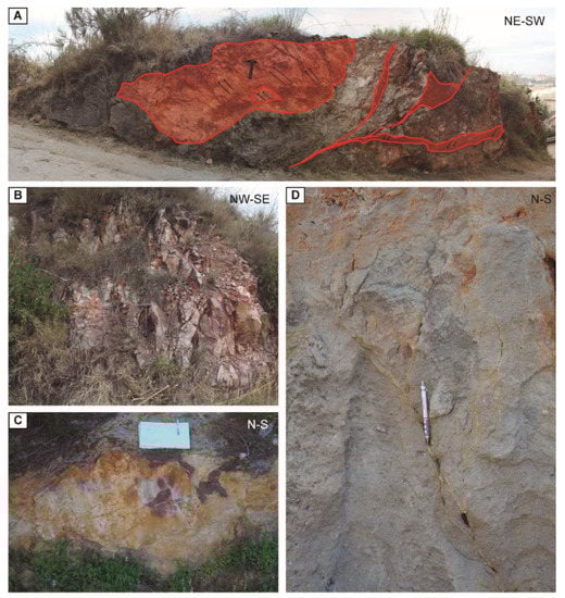 The first set of fractures is represented by NE–SW to NNE–SSW trending joints and normal and strike-slip faults with highly variable dips (Figure 2B). This array has been mainly observed in the southeastern part of the hill. In the far outcrop, a 20 m thick fault zone parallel and subsidiary to the Morrot fault is observed (Figure 3A,B). Individual planes are discrete and undulating, forming an arrangement of sigmoidal shapes that indicate dip-slip movement of the fault zone (Figure 3A,B). Fault planes show both dip-slip and strike-slip slickenlines, the latter being probably the result of the re-activation of the previous normal faults during the Messinian. Fault planes are cemented by silica and are surrounded by red to purple alteration halos towards the host rocks caused by the precipitation of iron oxides (Figure 3B). The second set of fractures is defined by E–W to WNW–ESE trending normal faults and joints dipping between 60 and 85° to both N and S (Figure 2B). They are characterized by straight to slightly undulating discrete planes (Figure 3C). Finally, the third set is constituted by N–S to NNW–SSE trending normal faults and joints with high dips (80–90°) to the E and W (Figure 2B). Commonly, these faults show horsetail endings (Figure 3D). Some fault planes of the second and third sets appear enlarged by dissolution and are cemented by silica minerals or filled with breccias cemented by silica, whereas other planes are coated by orange to purple iron oxides (Figure 3C,D).