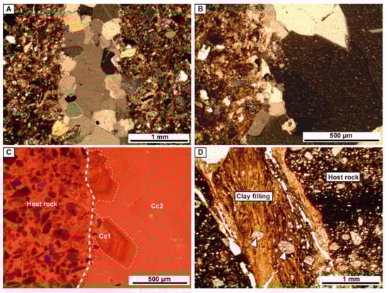Fracture fillings from the non-silicified area and silicification front. (A) Fracture from the non-silicified area cemented by a drusy mosaic of equant calcite crystals (XPL). (B,C) Cross-polarized and cathodoluminescence images of a fracture from the non-silicified area filled with two generations of calcite cement. The fracture wall is marked with a white thick dashed-line. Note the gradual transition from the bright orange-brown zoned luminescence (Cc1) to the uniform bright orange luminescence (Cc2). The white thin dashed-line shows the limit between the two calcite generations. (D) Fracture from the silicification front, affecting reddish fine-grained sandstones due to the presence of iron oxide cement, filled with brownish clays and grains from the host rock (white arrows) (PPL). The limit between the host rock and the clayey filling has been marked with a red dashed-line.