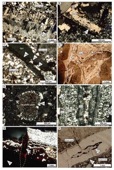 With regard to silica cementation, the sequence opal → lussatite → chalcedony →quartz is recognized (Figure 5C), representing an increase in crystallinity and purity towards the inner part of fractures. Purity is defined by the presence of cations other than silica (mostly in low crystallinity silica varieties) but also by the presence of clay-sized particles of other minerals coming from the sandstone matrix. Three successive phases of opal precipitation have been identified according to the amount of lithic fragments, the content in titanium oxides, and the different degree of recrystallization to microquartz (Figure 5C,D). In some of the thickest veins, opal shows millimeter-scale cracks and the silicic clasts develop both quartz rims and corrosion pits (Figure 5D,E). Lussatite has a fibrous texture, arranged in pseudospherulites, and usually forms single 20 to 35 μm-thick bands (Figure 5C,F). Chalcedony shows multiple precipitation episodes defined by 30 to 600 μm-thick bands constituted by fibers with radial disposition, spherulites or semispherulites (Figure 5F). It presents two varieties, chessboard chalcedony and chalcedonite. Finally, quartz precipitates in the remaining porosity as euhedral crystals (Figure 5F). Quartz crystals normally range between 20–70 μm in size but in some moldic porosity of the Castell cores (Figure 2B), they can reach 2 mm. This silica precipitation sequence locally alternates with precipitation of goethite (Figure 5G,H).
