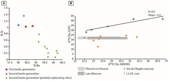 (A) Barite compositions plotted in a %Sr vs %Ba binary diagram. (B) δ34S vs δ18O binary diagram. Grey boxes represent the isotopic composition of seawater for the Late Miocene and from Pliocene to present according to [].