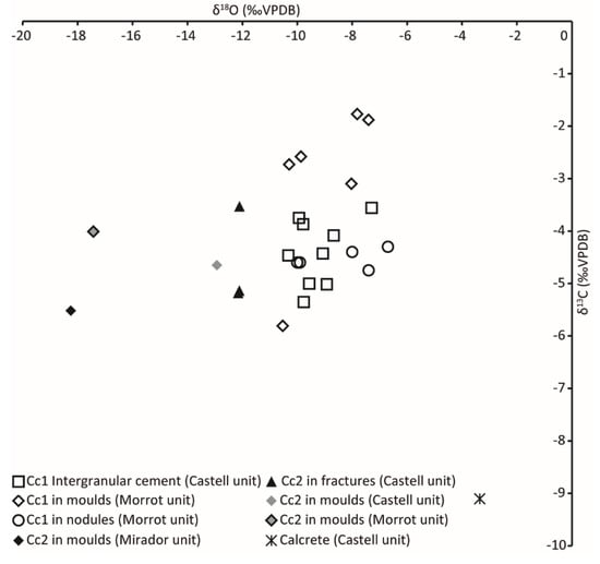 Calcite cement Cc1 fills intergranular porosity, usually as nodules, moldic porosity, and fractures. The exclusive presence of this cement in the Morrot and Castell units probably indicates that its precipitation was prior to the sedimentation of the upper units and thus, formed relatively early. This is consistent with the formation of the calcite nodules, a feature most frequently associated with early diagenesis [,]. The oxygen isotope signature of this calcite cement, which ranges between −10.5‰ and −6.7‰ VPDB, is consistent with precipitation from meteoric water [,]. The zoned CL pattern may reflect variations in the oxidation state produced by oscillations of the water table level [,]. Several authors have proposed that carbonate shells are the main source of calcite cement in the concretions [,]. In this study, this observation is supported by the presence of shell molds and δ13C values, which are consistent with a mixture of light carbon from soil-derived CO2 [] and heavier carbon derived from Miocene marine shells [].