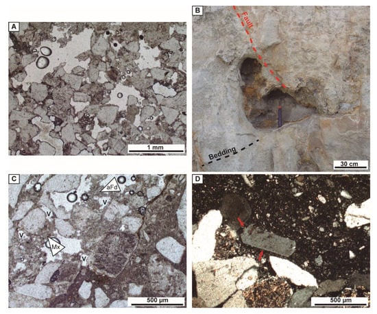Evidence of in situ dissolution and arenisation. (A) Vuggy porosity. (B) Cavern porosity developed at the intersection between faulting and bedding. (C) Vuggy porosity (V) produced by the matrix (Mx) and altered feldspar (aFd) dissolutions in a sandstone sample. Note how the feldspar grain in the center of the image is about to be included in the fracture by dissolution around its borders. (D) Feldspar grain removed from the host rock and included in the fracture infilling by a process of dissolution around the grain boundaries (red arrows) and erosion (arenisation).