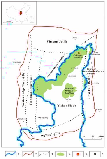 Geological map of Ordos Basin showing the location of the Shanbei Coalfield (Modified from Wang et al., []). 1. province boundary; 2. Ordos basin boundary; 3. tectonic unit boundary; 4. Shanbei Coalfield; 5. study coal mine; 6. main city in Ordos basin.