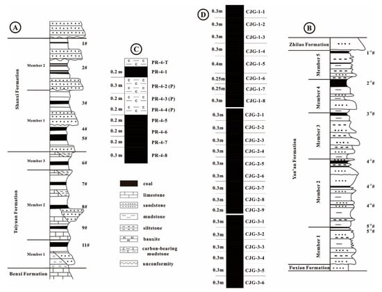 Based on the occurrence of different types of fossils, the Taiyuan Formation is subdivided into three members (Figure 2A), all of which were deposited in lagoon and tidal flat-barrier environments []. Member 1 overlies conformably the Benxi Formation limestone and is composed of bauxite, sandstone and coal seams (No. 10 and 11 Coal); member 2 is the main limestone-bearing section, which consists of limestone, sandstone, mudstone and, 3 coal seams (No. 9, 8, and 7 Coals); and member 3 contains limestone and one coal seam (No. 6 Coal) which has been extensively studied [,].